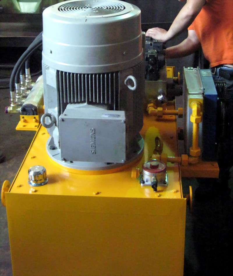 طراحی و ساخت یونیت هیدرولیک با فشار کاری 200bar شامل مخزن 1600lit ، پمپ کارتریج دوبل ولجان - VELJAN  ،  شیرآلات کنترل جهت و فشار شکن برقی بلوکی سایز یک و یک چهارم برای عبوردهی روغن با دبی حدود 600lit/min ، الکتروموتور زیمنس، خنک کن هوائی، فیلتر خط برگشت،  شیرهای یکطرفه بلوکی، پرشر سوئیچ Duplomatic و شیر decompression